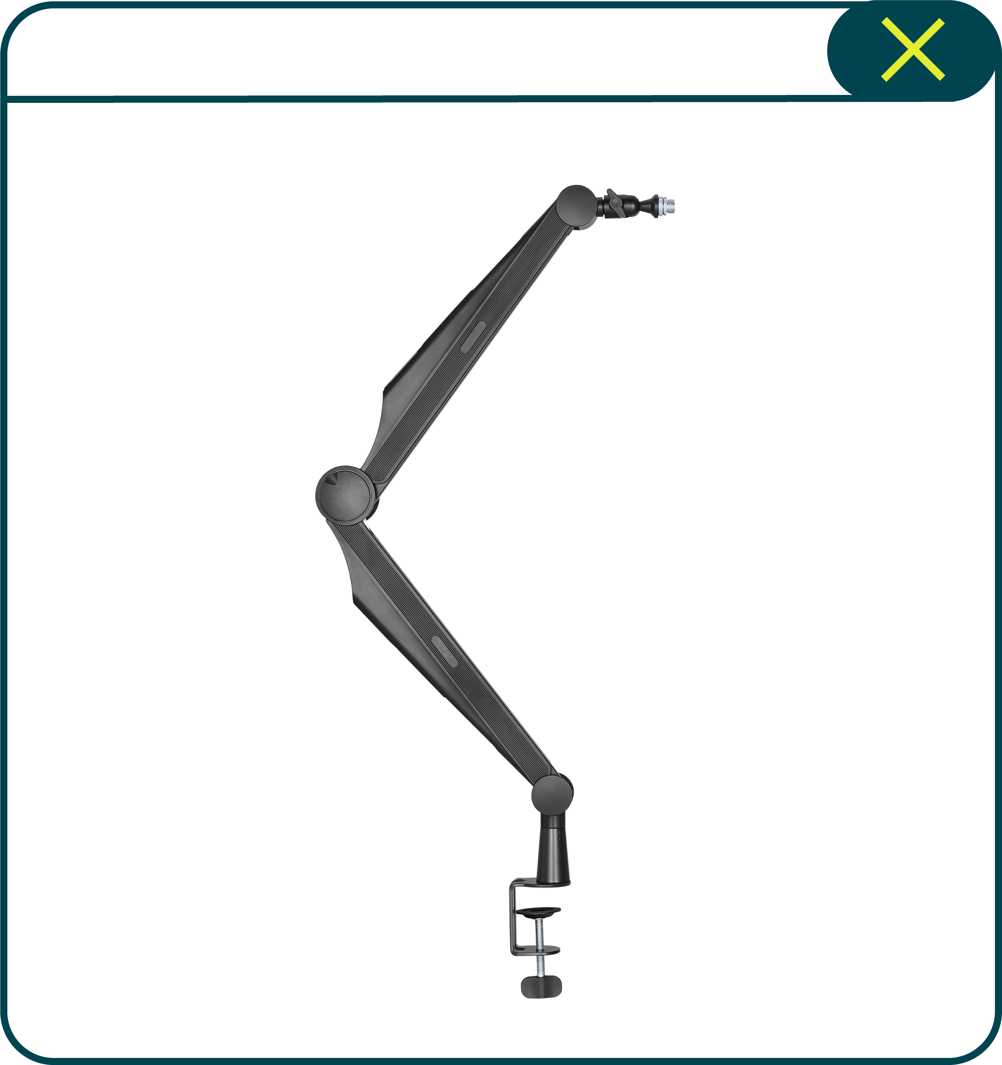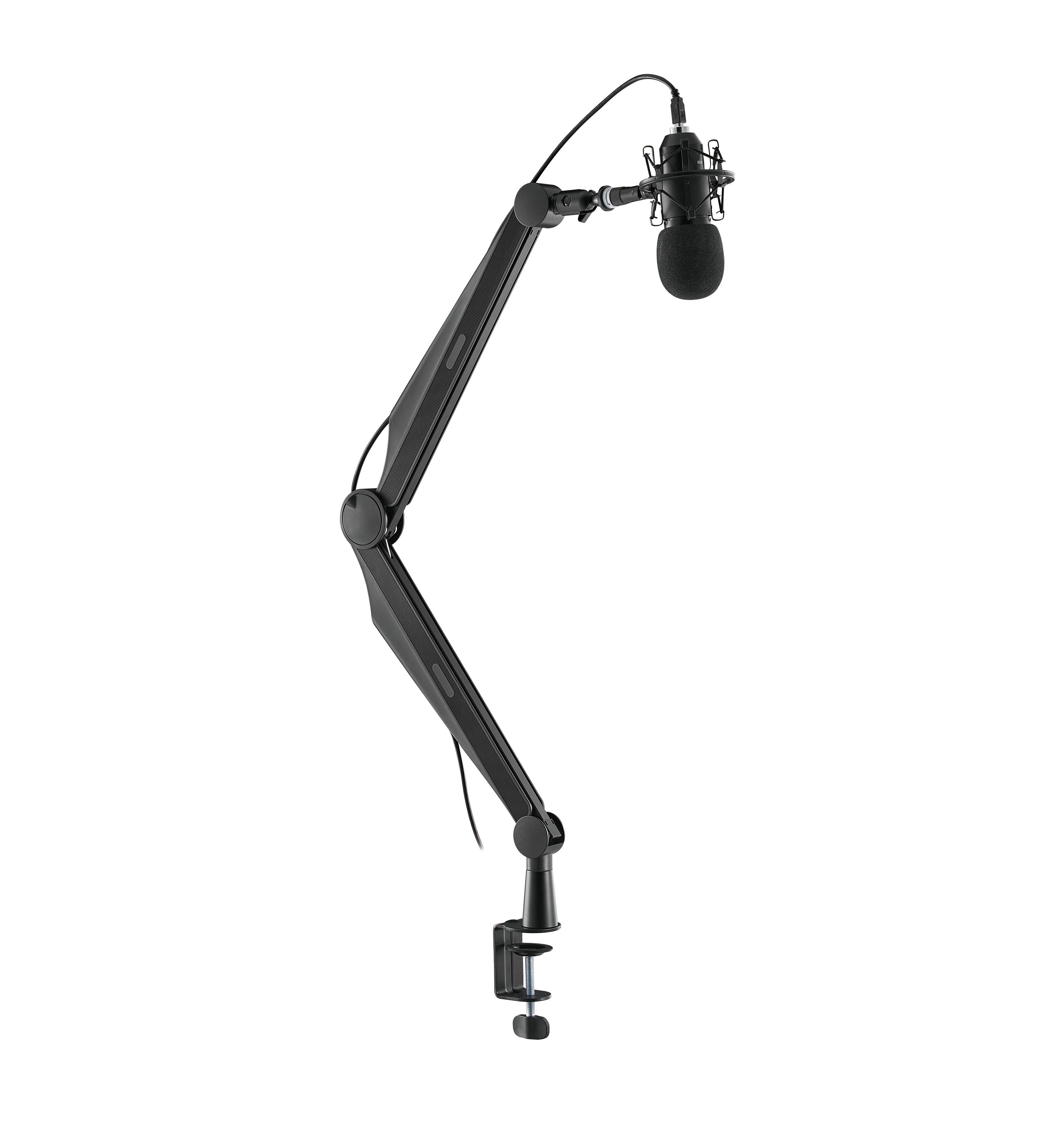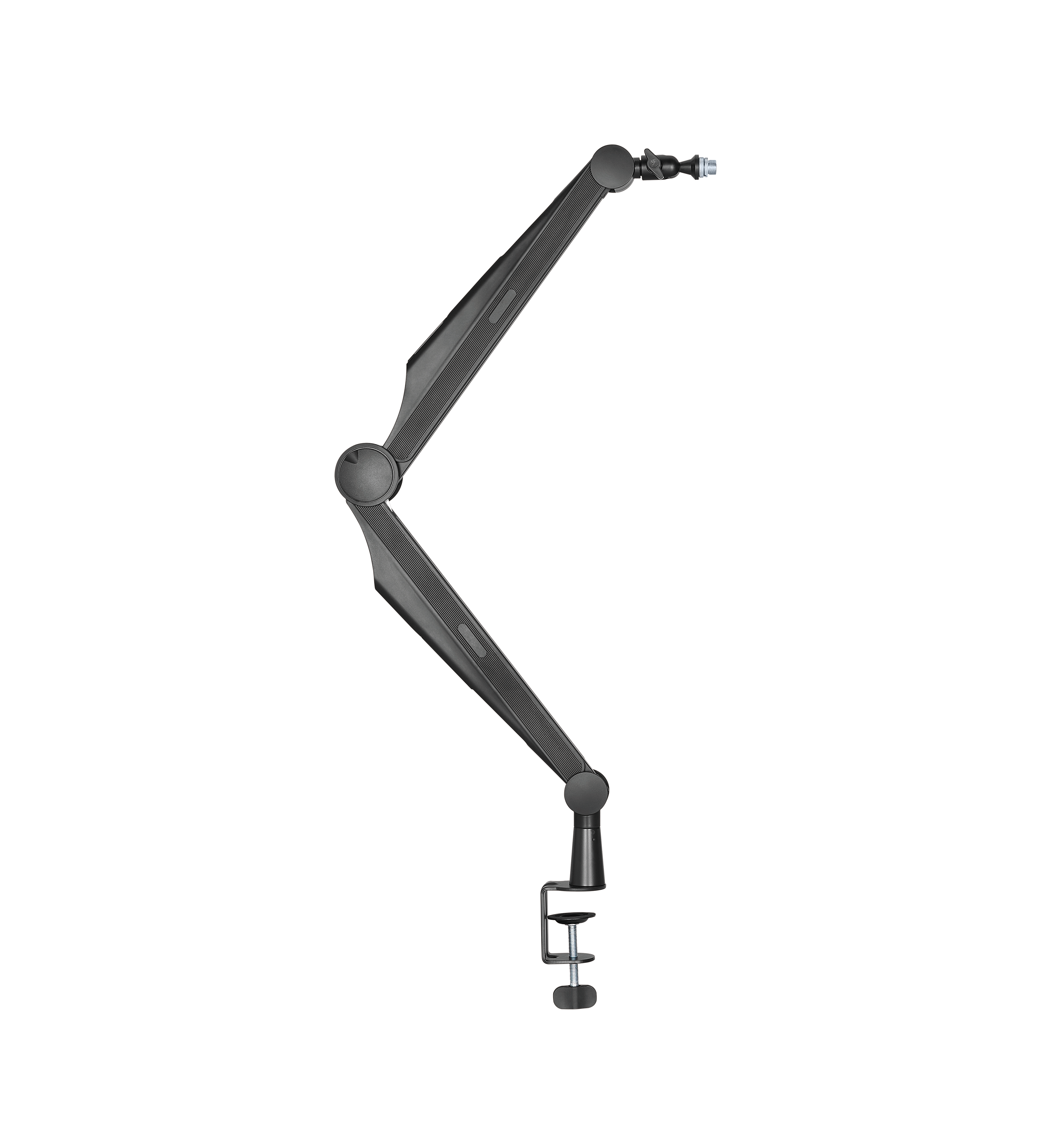 Soporte para micrófono adecuado para la mayoría de micrófonos vocales y dinámicos. Permite la orientación hacia adelante o hacia atrás, con rango de movimiento completo y organizador de cables.